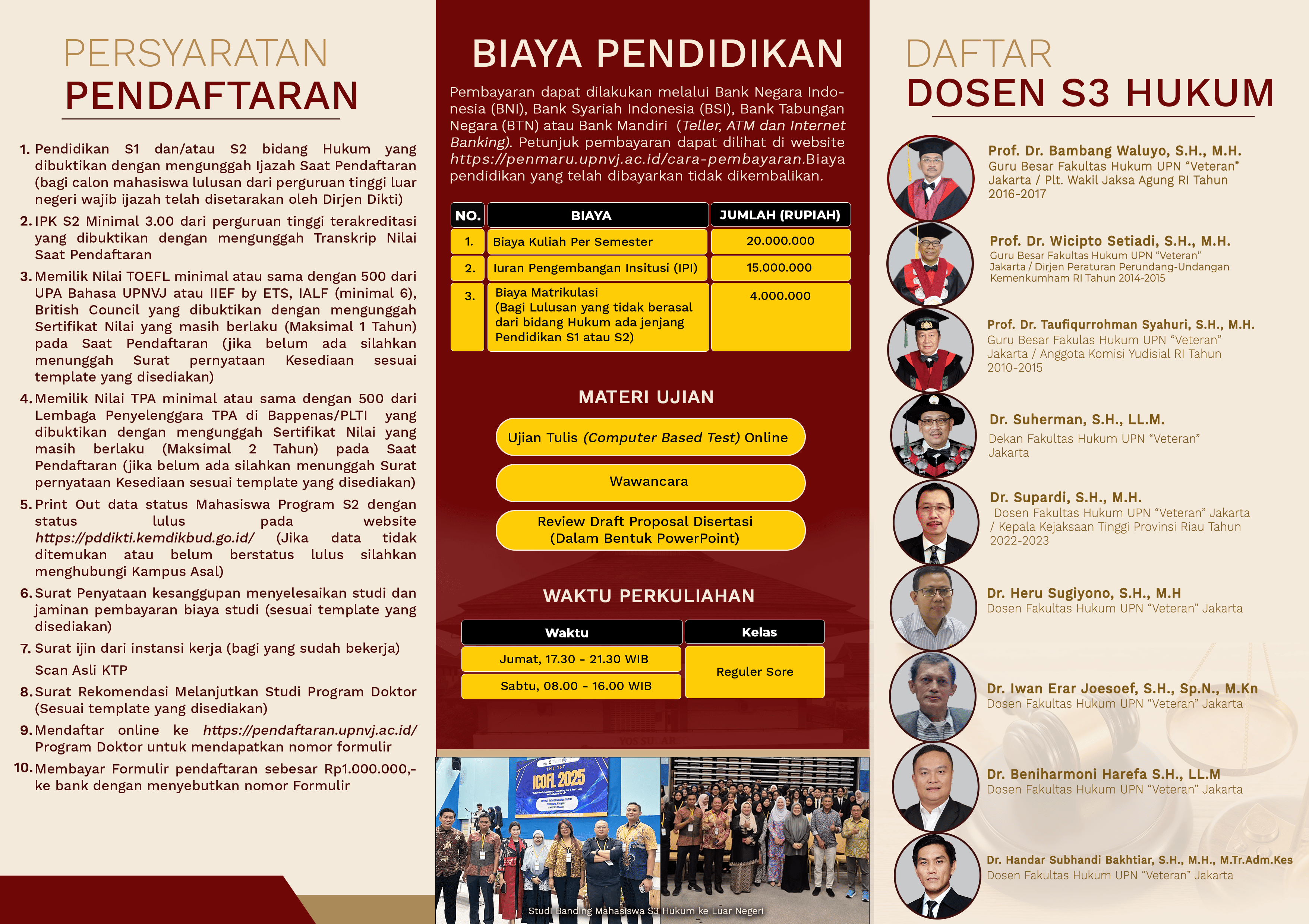 Fakultas Hukum Universitas Pembangunan Nasional “Veteran” Jakarta (FH UPNVJ) resmi membuka pendaftaran Program Studi Hukum Program Doktor (S3) untuk Tahun Akademik 2026/2027. Program ini dirancang dengan pendekatan interdisipliner dan integratif yang menekankan pada perbandingan hukum, pluralisme hukum, kearifan lokal, serta identitas bela negara dalam proses pembelajaran.