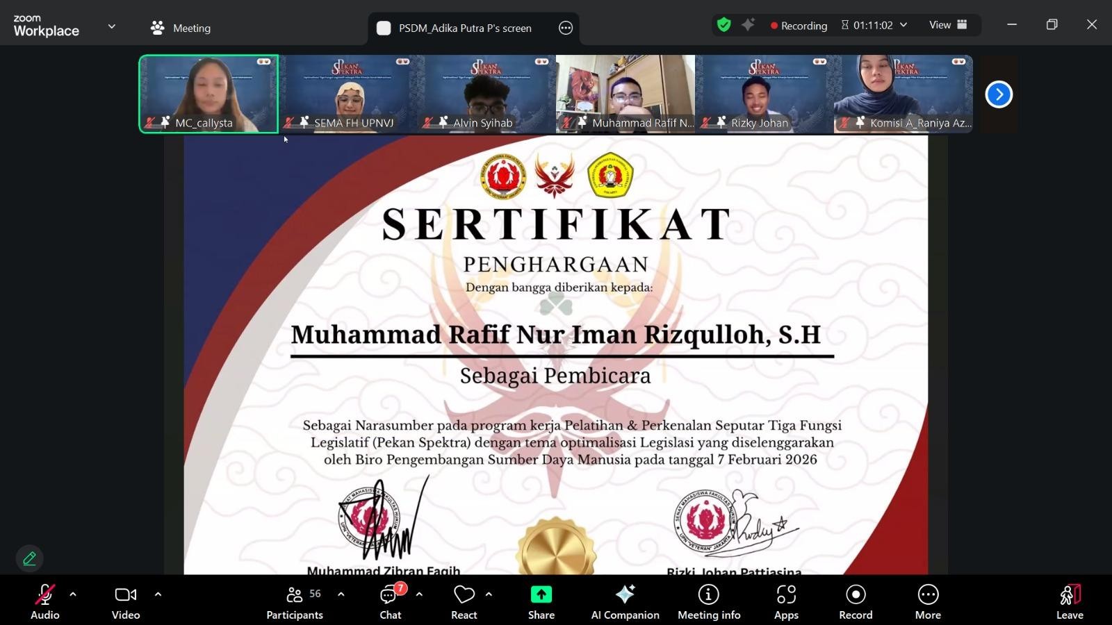 Jakarta, 7–10 Februari 2026Senat Mahasiswa Fakultas Hukum UPN “Veteran” Jakarta (SEMA FH UPNVJ) melalui Biro Pengembangan Sumber Daya Manusia (PSDM) sukses menyelenggarakan kegiatan Pekan Spektra 2026 sebagai langkah strategis dalam memperkuat kapasitas internal organisasi. Kegiatan ini dirancang untuk mengoptimalkan pelaksanaan tiga fungsi legislatif, yakni fungsi legislasi, fungsi aspirasi, dan fungsi pengawasan, guna menunjang pelayanan terhadap Keluarga Besar Mahasiswa Fakultas Hukum (KBM FH).