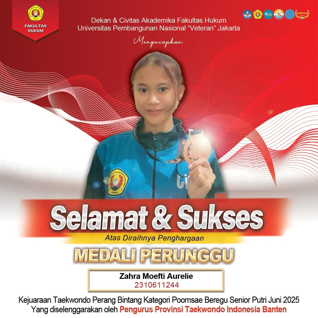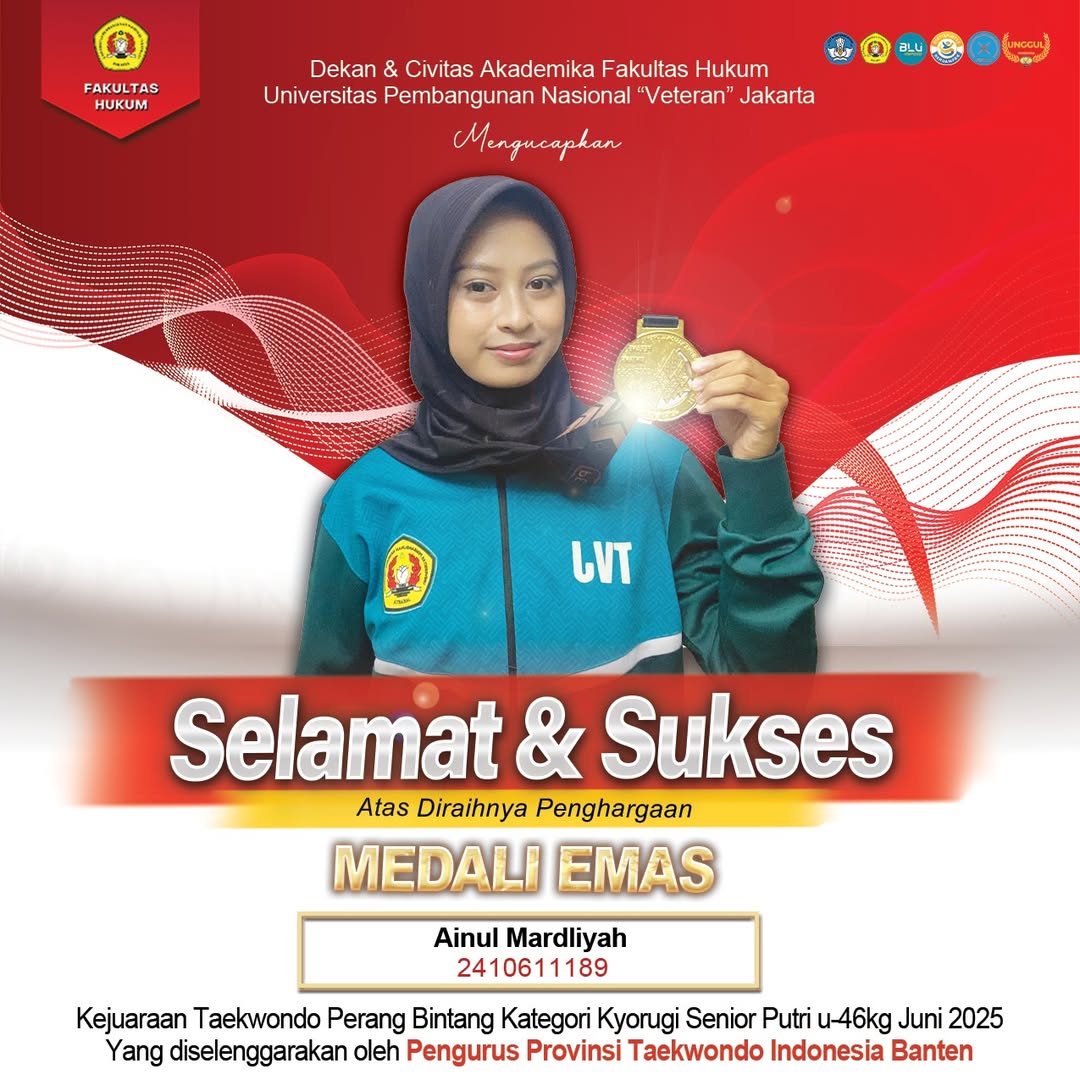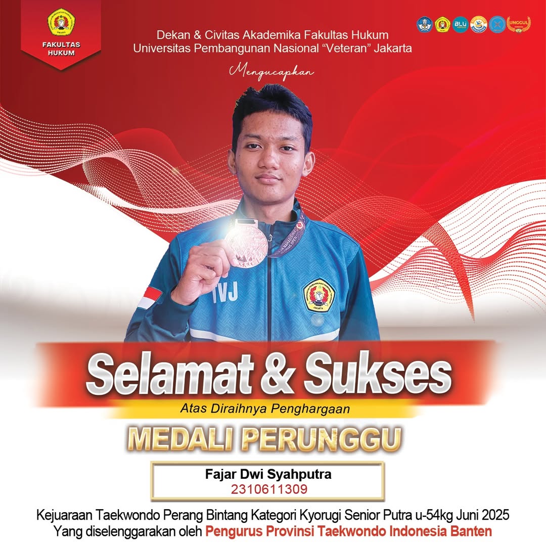 Berikut rincian prestasi mahasiswa Fakultas Hukum UPN “Veteran” Jakarta dalam Kejuaraan Taekwondo Perang Bintang yang diselenggarakan oleh Pengurus Provinsi Taekwondo Indonesia Banten pada Juni 2025: